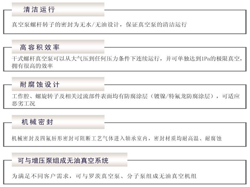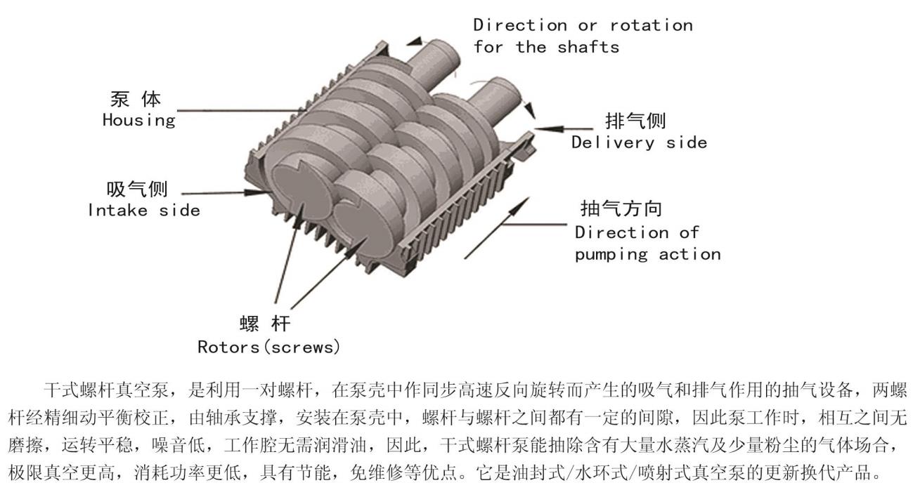 螺桿泵工作腔為間隙密封,無(wú)潤(rùn)滑油,是環(huán)保型真空設(shè)備,因此干式螺桿泵能抽除含有大量水蒸汽及少量粉塵的氣體,極限真空高,消耗功率低,具有節(jié)能、降耗免維修等優(yōu)點(diǎn),特別在半導(dǎo)體、電子工業(yè)中要求無(wú)油潔凈的場(chǎng)合以及化工制藥中對(duì)溶劑的回收工藝等具有不可比擬的優(yōu)越性。