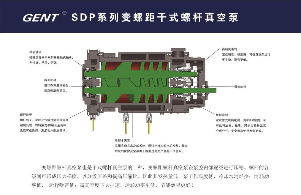 SDP變螺距螺桿真空泵又稱為干式螺桿真空泵,是由一對(duì)平行的螺旋狀轉(zhuǎn)子與泵體組成的一個(gè)工作室,經(jīng)五軸聯(lián)動(dòng)復(fù)合加工中心加工的二個(gè)螺桿轉(zhuǎn)子之間及其與泵體之間沒(méi)有摩擦且保持一定的間隙,兩個(gè)轉(zhuǎn)子與泵體之間形成了多個(gè)密封腔,轉(zhuǎn)子通過(guò)同比齒輪在泵殼中作同步高速反向旋轉(zhuǎn)時(shí),將各密封腔內(nèi)的氣體從進(jìn)氣端不斷地推向排氣端,而產(chǎn)生的吸氣和排氣作用的抽氣設(shè)備。